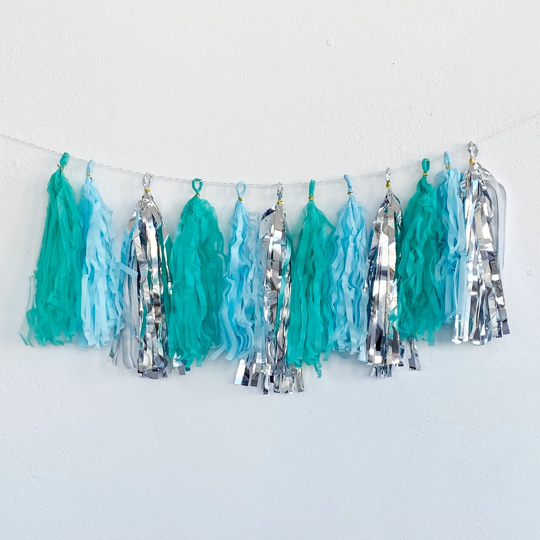 Adding a garland to your party decor gives an extra level of dimension and eye-catching fun. With shades of blue and pops of silver this one is sure to bring those cool vibes to your next event.