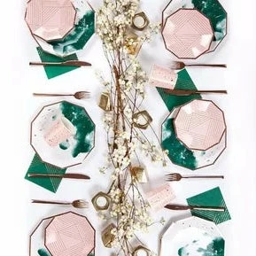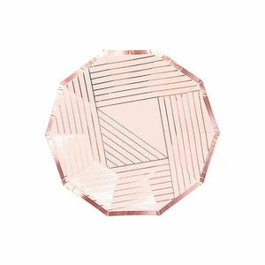 Soft and romantic, these rose pink decagon party plates adorned with delicate rose gold lines are perfectly made for showers, birthdays and special affairs.