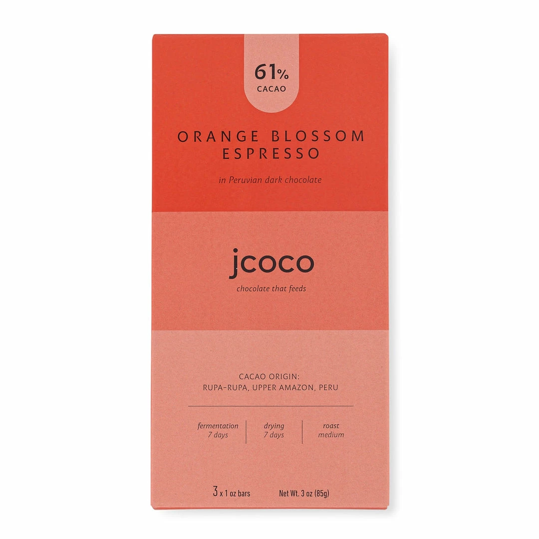 Orange Blossom Espresso is our chocolate bar take on the classic tradition of coffee paired with citrus. Deeply aromatic orange oil melts into notes of creamy espresso, a hint of black tea and cloves, and 60% dark cacao. One bite will transport you to a charming sidewalk café, as you lose yourself within this timeless taste experience. Each jcoco envelope contains three 1oz chocolate bars.