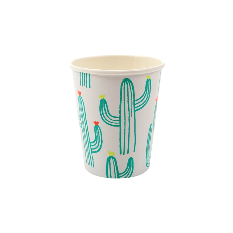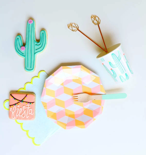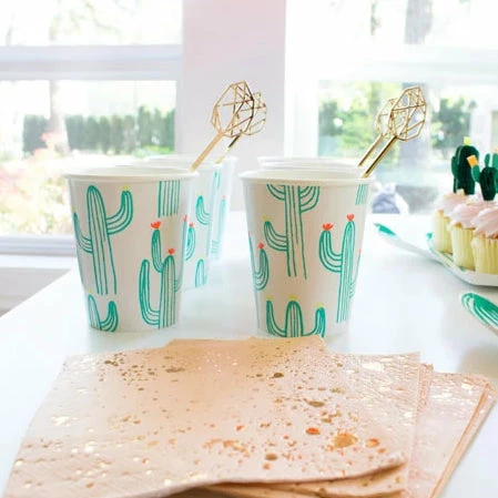 A set of stylish party cups with cacti designs in bright colors, perfect for a summer celebration.
