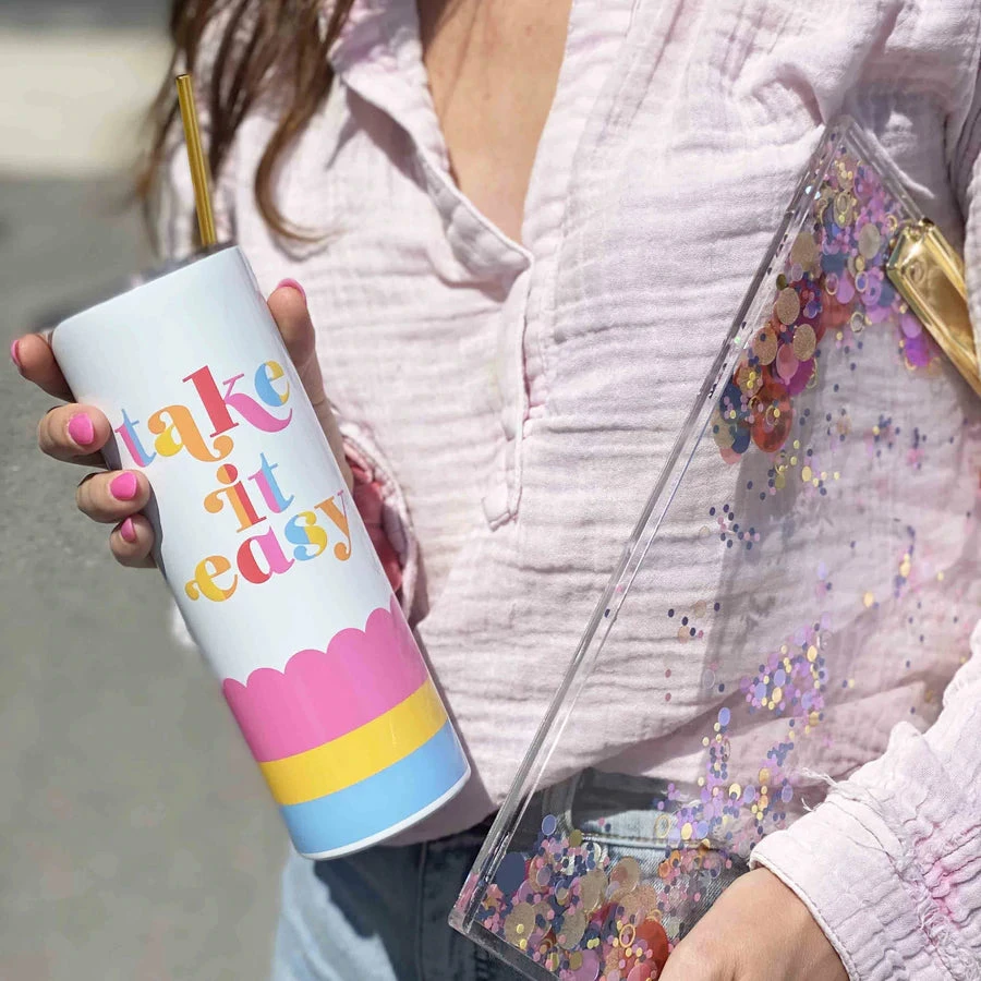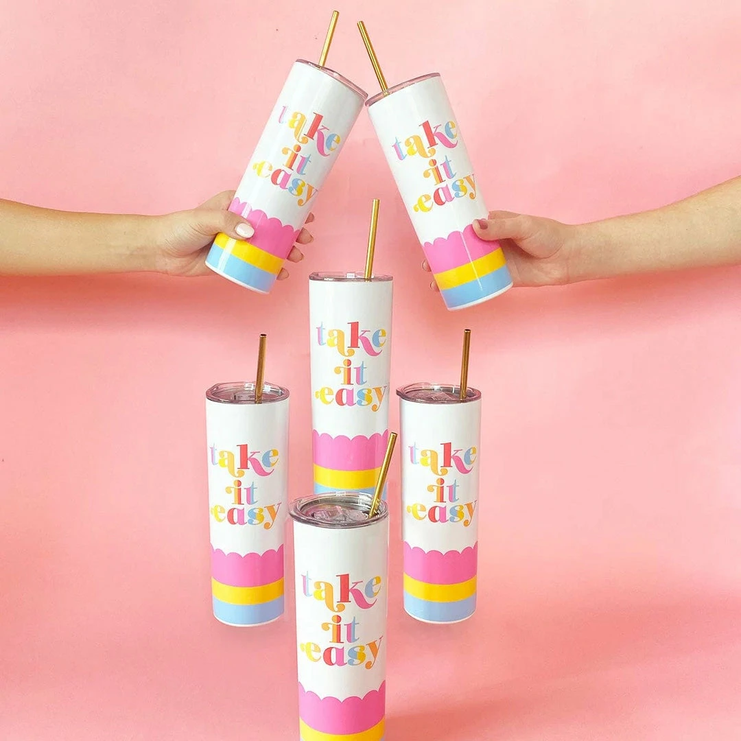 Take it easy (and cute) thanks to this stainless steel tumbler we designed! Built to keep your drinks extra cool in the sunshine is this fun sipper you and all your friends are gonna want. Cheers to that!
