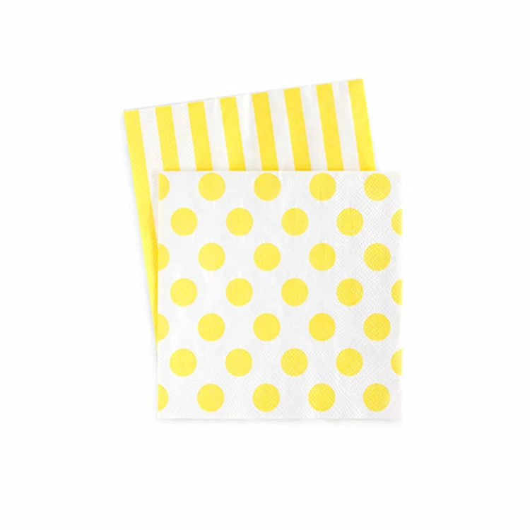 Add some bright fun to your next party with these double sided dinner napkins. They feature a bold yellow stripe on one side and fun dot design on the other.
