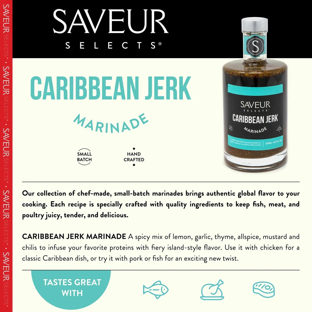 SAVEUR Selects Caribbean Jerk Marinade is a fiery, island-style blend of lemon, garlic, allspice, mustard and chilies set to make your mouth water. The chef-made marinade does it all to keep your favorite proteins tender, juicy and full of flavor. A spicy Caribbean classic with chicken, try it with pork or fish for an exciting new twist. For curious cooks with a taste for global cuisine, the SAVEUR Selects Pantry Collection serves up authentic flavors from around the world. Inspired by the stories found on the pages of Saveur magazine, each gourmet recipe is hand-crafted in small batches using the finest quality natural ingredients. SAVEUR Selects Caribbean Jerk Marinade contains no high-fructose corn syrup or MSG. SAVEUR Selects sauces, marinades, and seasonings are certified by the Global Food Safety Initiative (GFSI), the Women-Owned Small Business (WOSB) program, and the Women Business Enterprise (WBE) program.